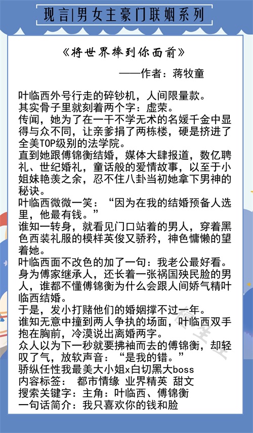 小短评:男主是女主哥哥的好友,女主年少时暗恋男主,但男主言词犀利(有伏笔)把她那点爱恋的火苗给骂熄了。后来两家合作,利益捆绑加上对女主有点小好感,男主就同意联姻了。婚后,女主傲娇自恋活得精致,男主冷淡矜贵冷幽默高手,看似挺般配的,但由于聚少离多,女主在国外读法学,男主在国内管企业,感情略平淡。故事发生在女主毕业前夕回到国内,她在男主的宠宠宠中迷失了“表面夫妻”的初心……后面基本上都是女主当律师的实习日常,以及发糖时间。整体看着挺欢乐的,不过这本书褒贬不一,有兴趣的亲可以去看看!