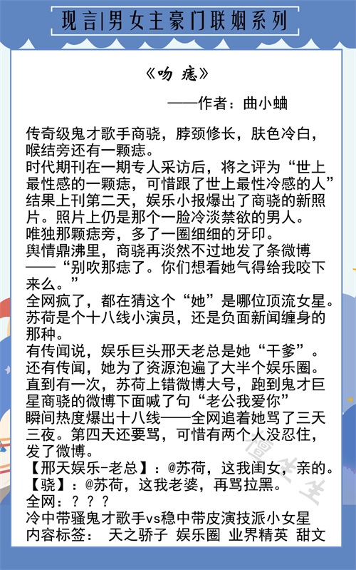小短评:一对互看不爽,一见面就互怼的青梅竹马,因为商业联姻走在一起的故事。先婚后爱,小时候是冤家,长大后换了身份,刚开始有点不太适应,但吵还是要吵的,闹也是要闹的,反正大家什么性子都彼此了解得透透的。婚姻生活火花四溅,很快就点燃通往内心那条线,额,接下来大型真香现场,还是双箭头!两人开始磕磕绊绊相爱,感情越来越浓,甜甜腻腻,一路发糖不止,惊呆了小伙伴们……小甜饼,轻松沙雕文风,可看!