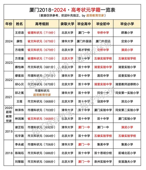 虽说今年未出状元。但毕竟2018~2023年,是年年有出市状元。2023年也有省理科状元(方思童,710分,北大),与一中分庭抗礼。2020~2023年,更是独霸厦门高考状元榜。