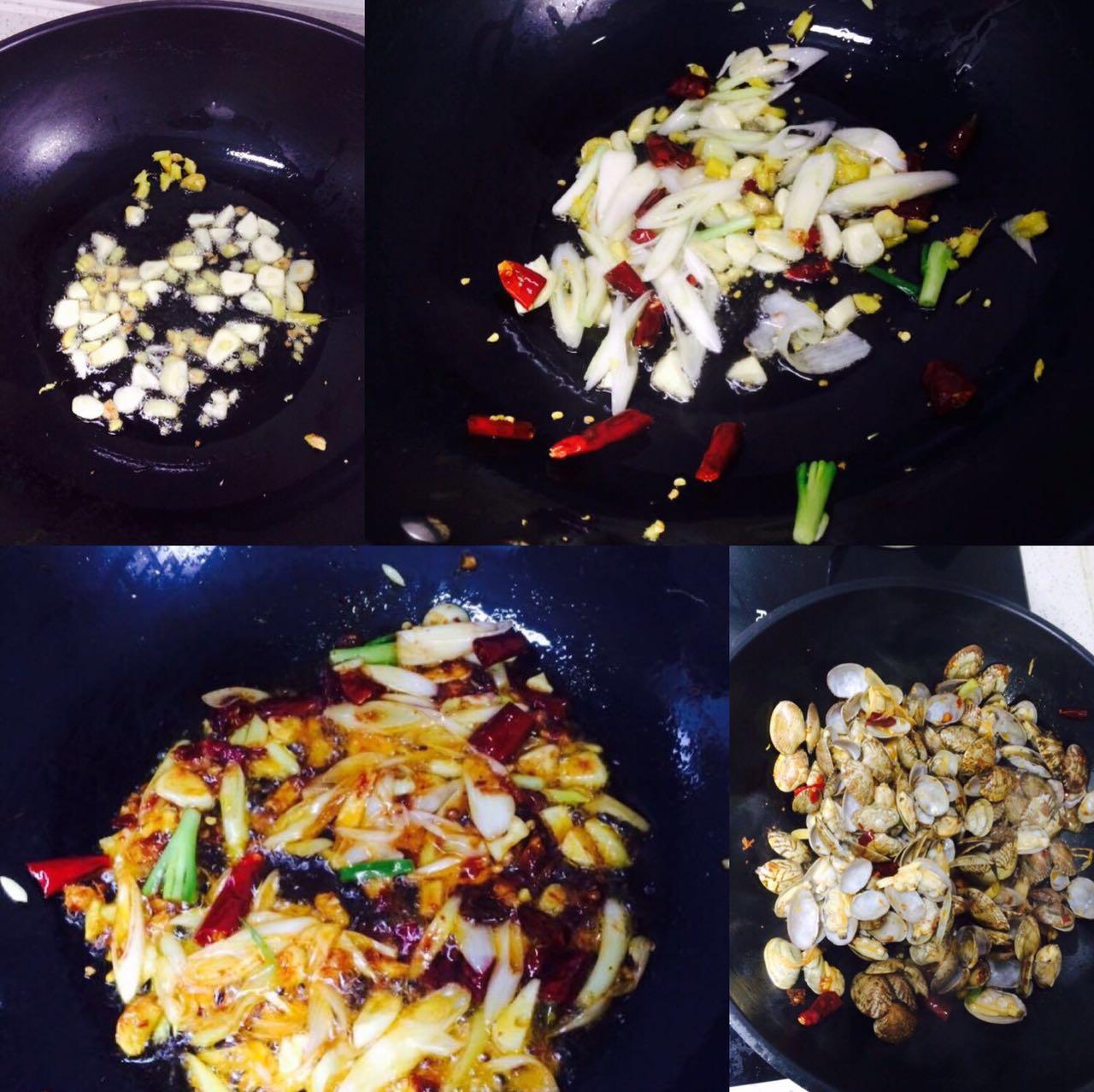 锅里放适量的油,放入准备好的姜蒜爆香,加入干辣椒段、小葱段和大葱翻炒,炒香后放入适量豆瓣酱(味道会更鲜香),倒入花甲爆炒,不停的翻炒,让花甲更入味。