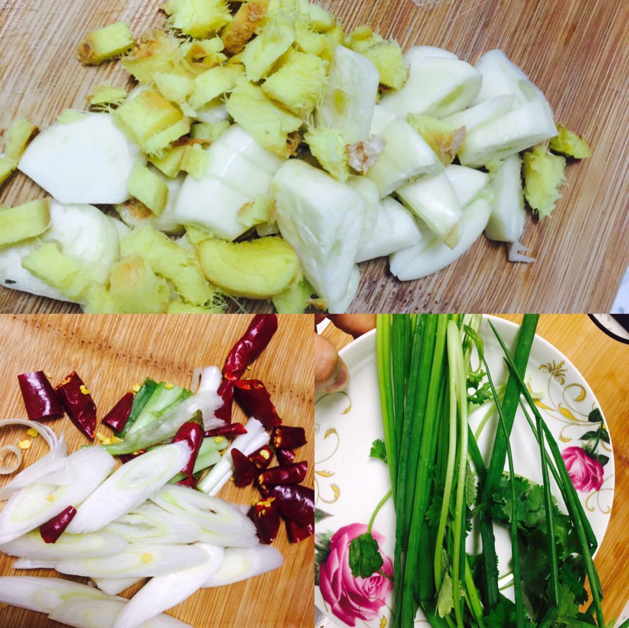 提前准备好需要的调料,姜、蒜、大葱、小葱、干辣椒和香菜。