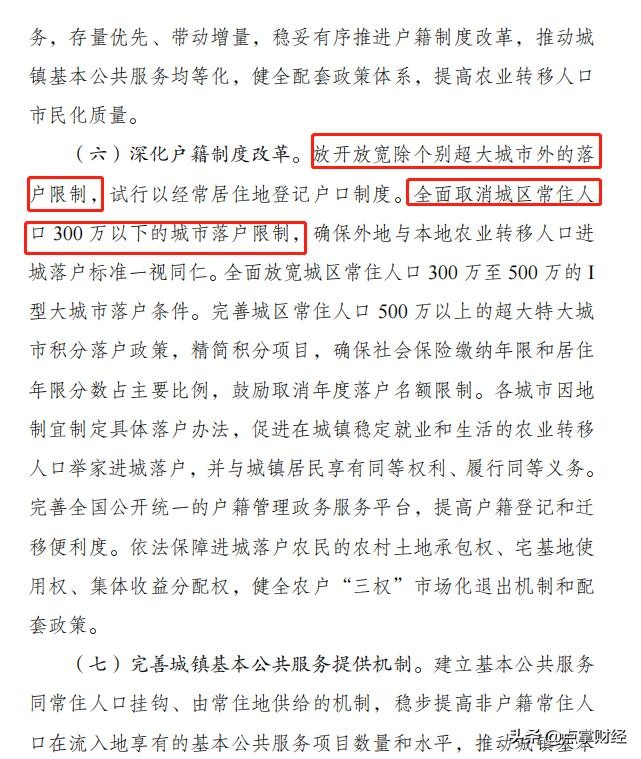 本次发改委发布的《“十四五”新型城镇化实施方案》,明确提出,将深化户籍制度改革,放开放宽除个别超大城市外的落户限制,全面取消城区常住人口300万以下的城市落户限制,确保外地与本地农业转移人口进城落户标准一视同仁。