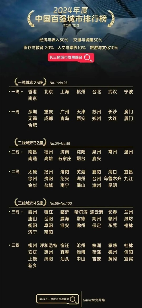 不久前,城市研究论坛 《长三角城市研究峰会》发布了我国2024年百强城市的排行榜,根据该排行榜显示,我国的新一线城市增加至23座,其中一线城市+八座,一线城市15座。