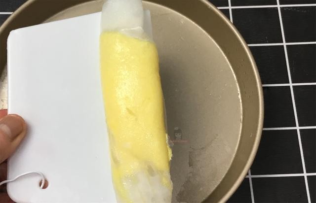 5、把刮板抹上油,这样防止粘刮板,用刮板从一头往前推。这样薄薄一层,带有鸡蛋的肠粉做好了一张。