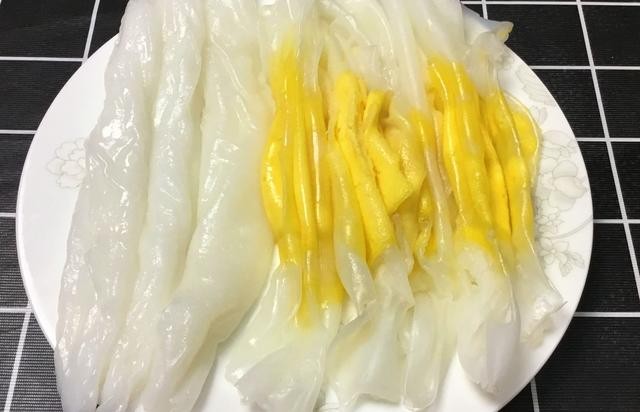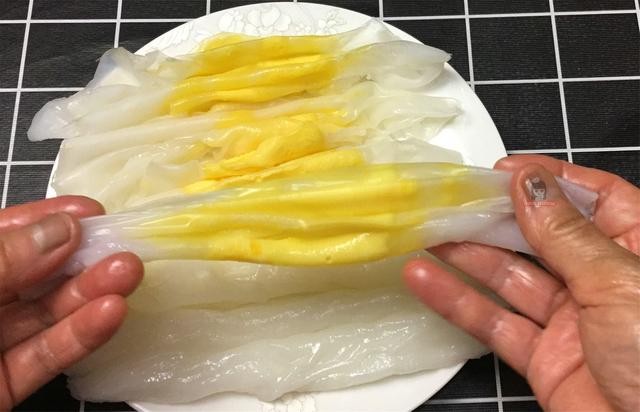 7、今天做的肠粉特别的筋道,用手一抻非常的有弹力。放上我们榨好的料汁就可以开吃了。晶莹透亮,非常有弹力的又好吃的。肠粉就做好完工,虽然是家庭版的,但是非常的好吃,做了一大盘子孩子吃得特别的香,喜欢风雨彩虹的亲们,请点个赞,也给你的家人做一个这样家庭版的肠粉吧。
