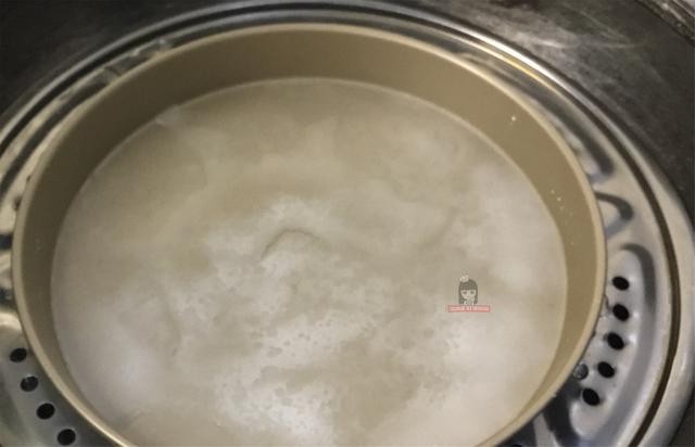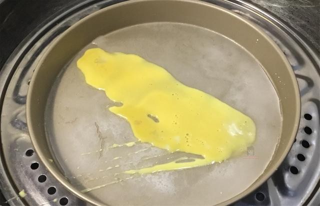 4、锅中水烧开,放入粉浆烤盘,全程大火。粉浆稍微定型在上面撒上鸡蛋液。喜欢放青菜的可以放青菜,放上你自己喜欢的都可以。看粉皮鼓起泡泡就熟透了,就可以拿出。