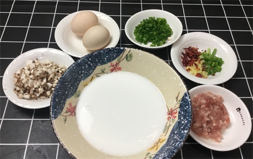 肠粉150克、鸡蛋2个、肉末50克、香菇1朵、 生抽5ml、老抽2ml、