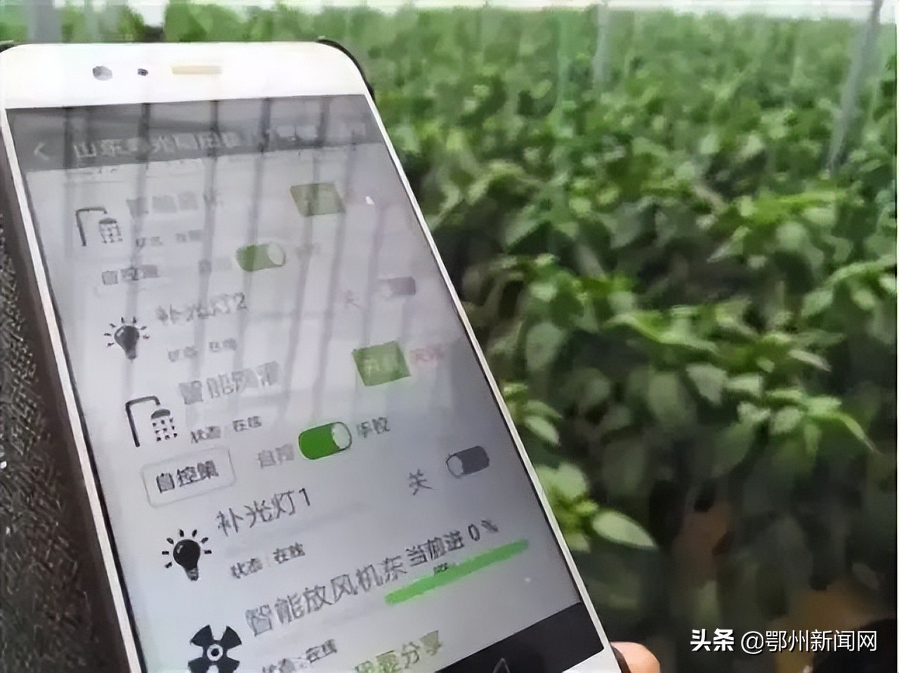 ▲在山东寿光,工作人员手机远程遥控蔬菜大棚