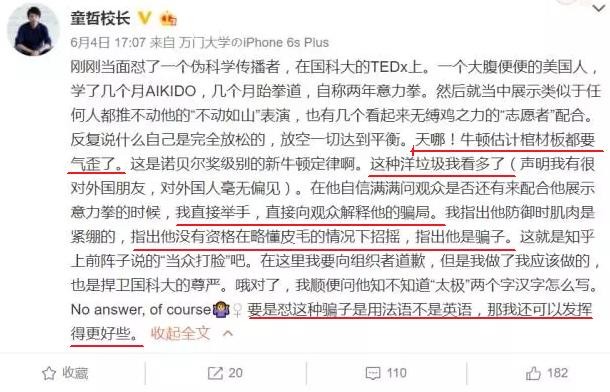 他出席TEDx,有一位演讲者展示自己所谓“不动如山”的意力拳时,他当面指出其是骗子,还发了微博。这件事情在知乎上成为一个热度很高的话题。