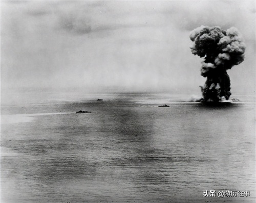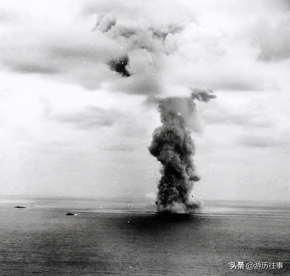 14时15分,大和舰左舷再中1雷,航速渐渐减至7节。舰长被迫发出了弃舰令。14时23分,大和舰突然发生主炮弹药库大爆炸,葬身海底,全舰2498名官兵(连同司令部人员共有2767人)中仅有269人获救(另有7名司令部人员获救),其沉没地点在日本九州岛南西50海里,德之岛西北200海里,东经128度04分,北纬30度43分。图为1945年4月7日大和号沉入海中并爆炸,在海面产生巨大的蘑菇云。