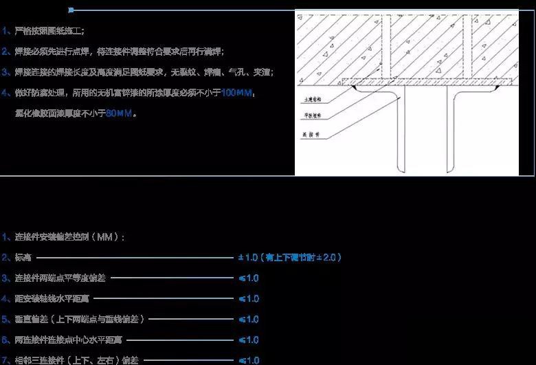 (2)偏差在45mm~150mm时,加接与预埋件等厚度、同材料的钢板,一端焊接(焊缝高度≥7mm),另一端采用可靠方式固定;
