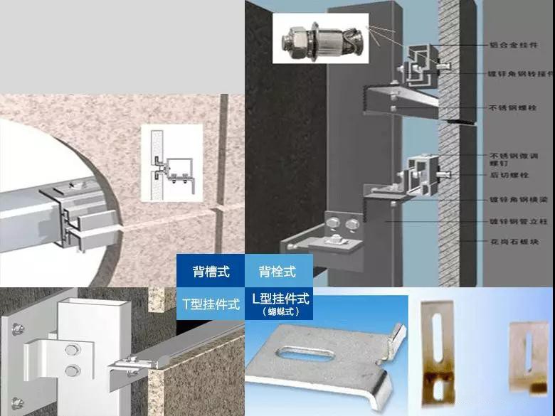 3、背拴式:此种挂件由德国引进,即在石材的背部打孔用钱栓与龙骨连接,由后切式锚栓及后支持系统组成的幕墙干挂体系,因机械式锚固结构,不以柔性结合,不能解决好因温差造成的热胀冷缩变形问题。由于胶固剂直接决定着锚固件的牢固性能,且操作繁琐、故机械、锚固结构在借界范围仲用备不大。