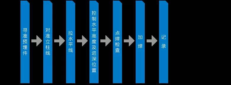 检查埋件进出时,测量人员需在每15m布置一根从首层至顶层的钢线,横向可采用鱼丝线进行检查。