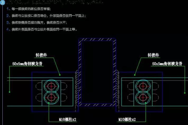 在测量放线过程中,预埋件及结构的检查相继展开,测量人员需将埋件标高、分格线均用墨线弹在结构上,依据十字中心线,再有施工人员用尺子进行测量,检查出埋件的上下、左右偏差。