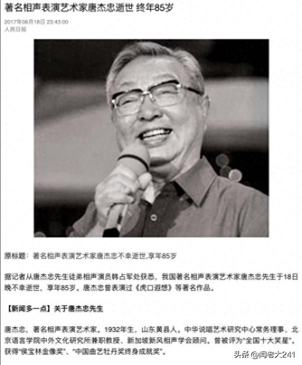唐杰忠作为有名的相声大师,他给很多观众带去了欢乐,获得了很多观众的喜欢,却在85岁的那年不幸患病去世,老伴没多久也跟着去了。