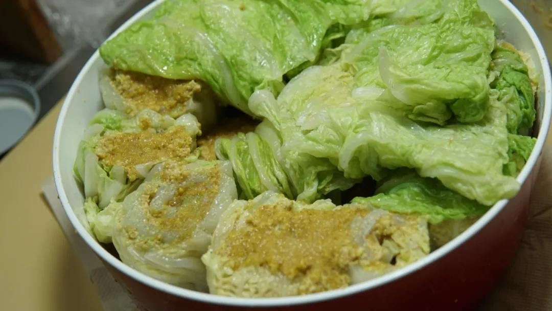3片白菜为一组,涂满一层芥末后再叠上一片,最后撒满砂糖即可。从最下面一片白菜卷起,用绳子固定,切成适合容器深度,一旁待用。