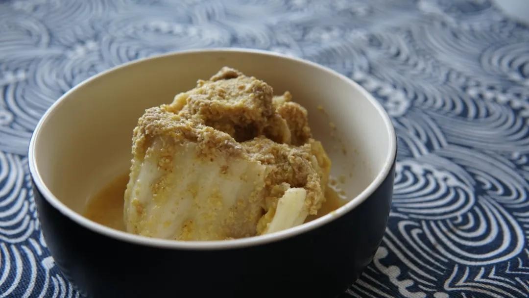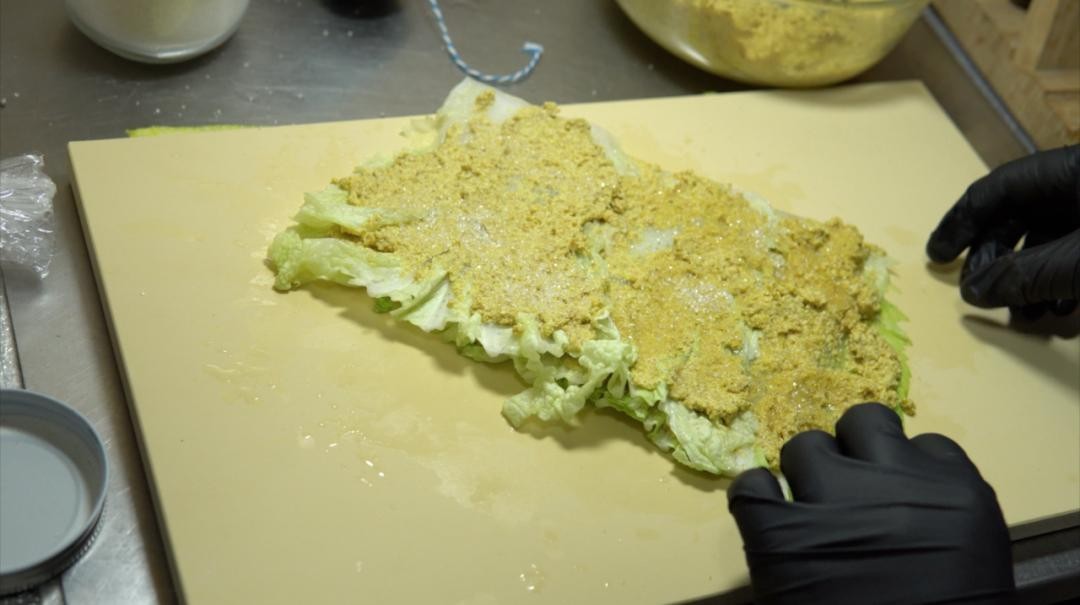白菜头直接涂上芥末放入就可以。将剩余的芥末涂抹在上面,撒上一层砂糖,用白菜叶包裹。放到温暖位置,发酵5-10天。