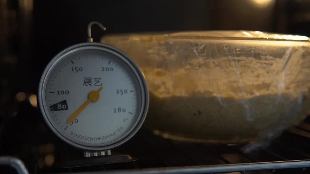 预热烤箱温度50+,烤盘内倒入少量温水,开下层加热。此时“手”放入烤箱,感到温暖,环境温度即在20-30度。