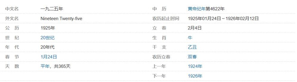 公元1925年,黄帝纪年第4622年,民国十四年,公历平年,共365天,53周,农历乙丑年(牛年),闰四月,共385天。
