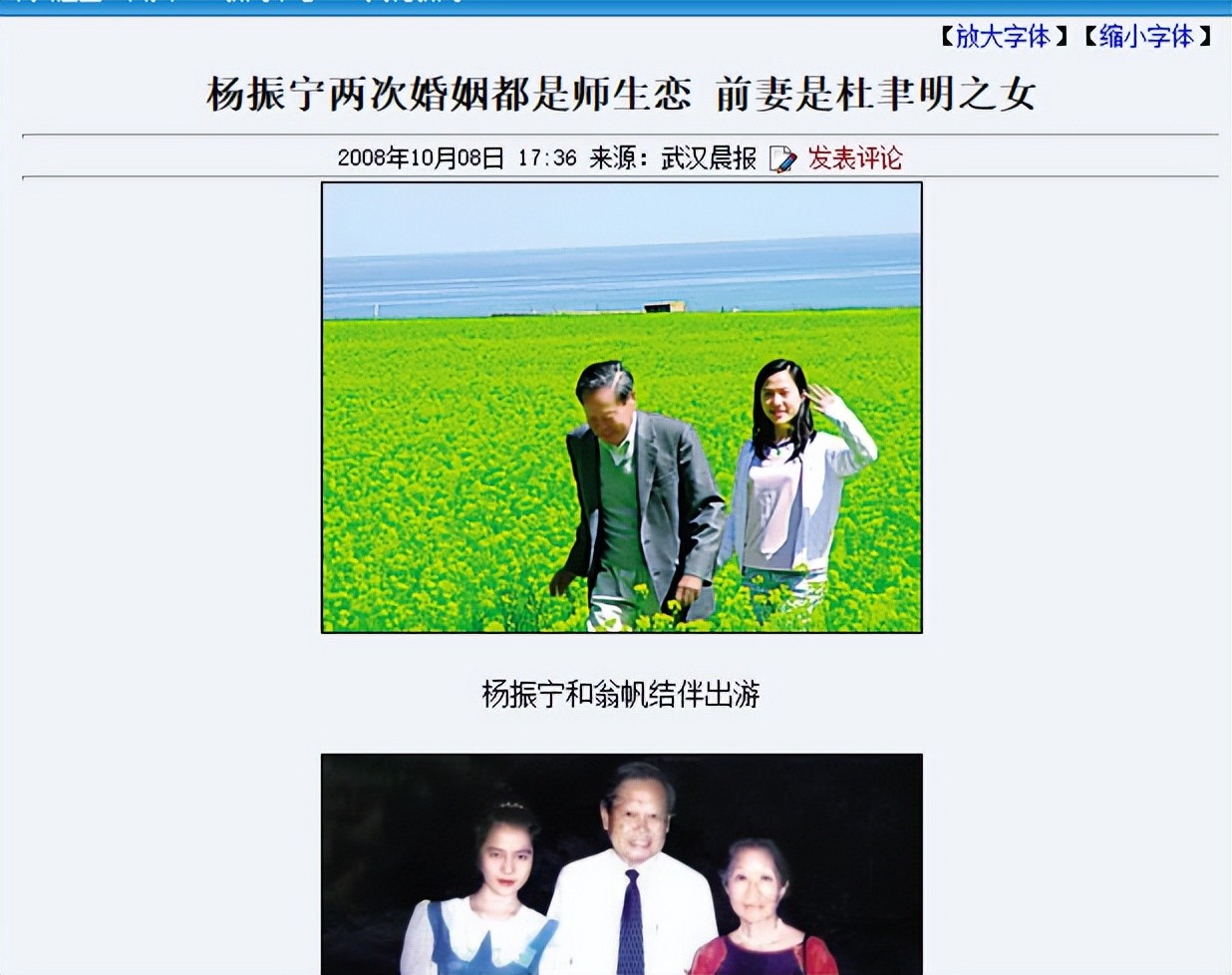 原文登载于武汉晨报2008年10月8日关于《杨振宁两次婚姻都是师生恋 前妻是杜聿明之女》的报道