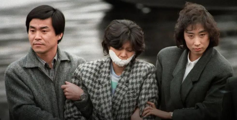 导语:1987年两个朝鲜特工将韩国一个搭载115人的飞机炸毁,却在事后受到韩国人民的宽恕,连总统都将她特赦。