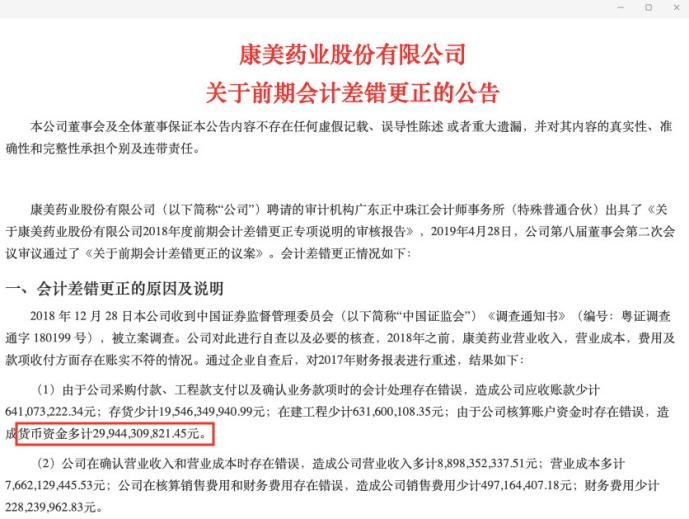 2019年4月,康美药业发布《关于前期会计差错更正的公告》的通知,内容大意是:由于会计计算出错,导致2017年财报虚增资金299亿多元。