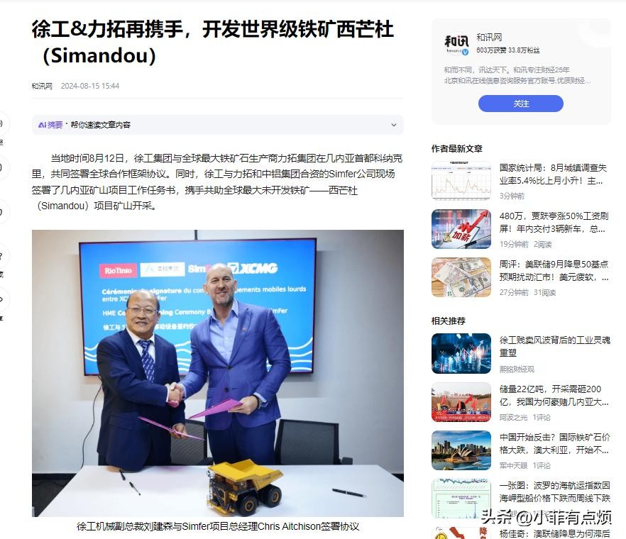 和讯网2024-08-15 ——徐工&力拓再携手,开发世界级铁矿西芒杜(Simandou)