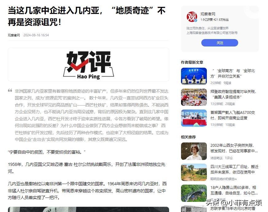 观察者网2024-08-16 ——当这几家中企进入几内亚,“地质奇迹”不再是资源诅咒!