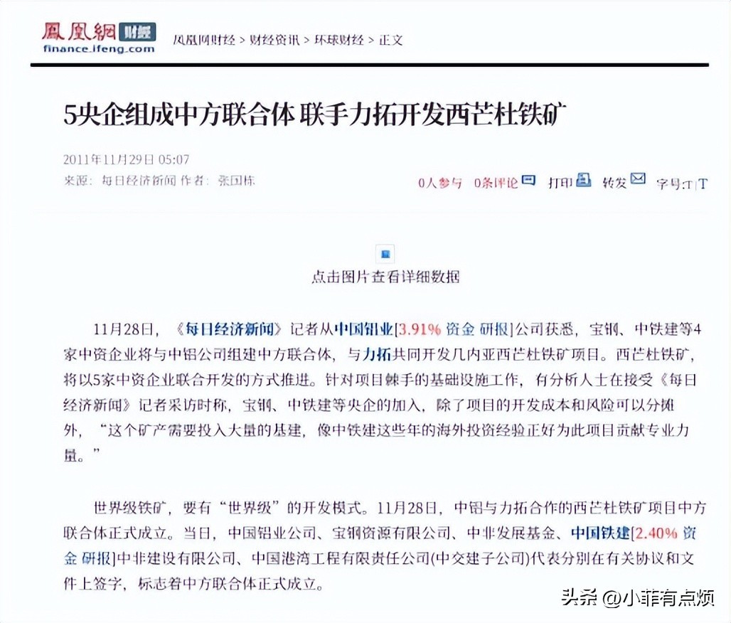 在2011年的1月28日,中国的铝业公司开启了一场和力拓集团的合作,主要的项目就是几内亚的西芒杜铁矿,当时参与的中国企业还有中铁。