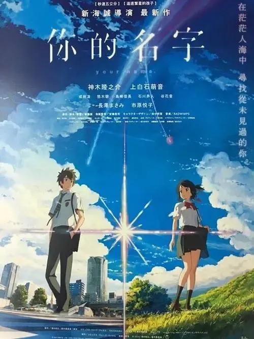 《你的名字。》是新海诚执导,神木隆之介、上白石萌音担任主要配音的一部原创日本动画电影,于2016年8月26日在日本上映。中国内地于2016年12月2日上映。影片讲述了男女高中生在梦中相遇,并寻找彼此的故事。中国大陆于2017年8月26日全网首播。