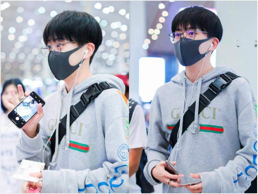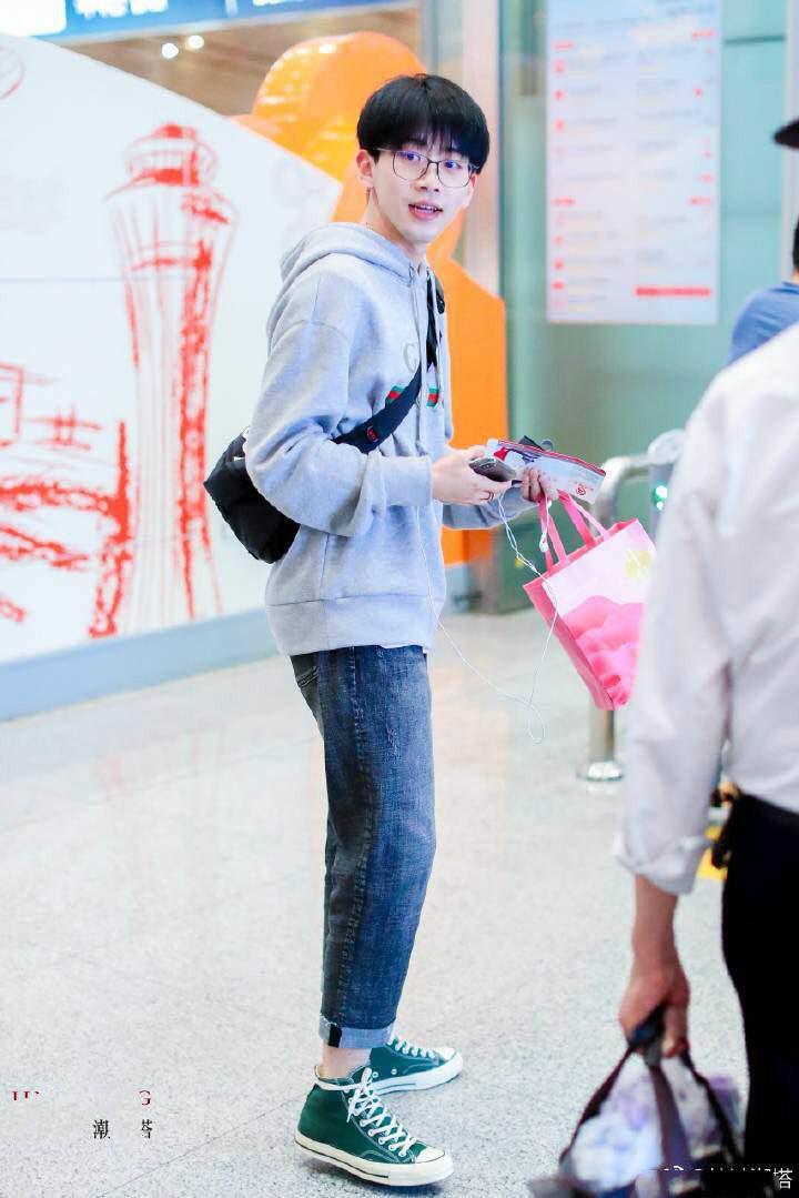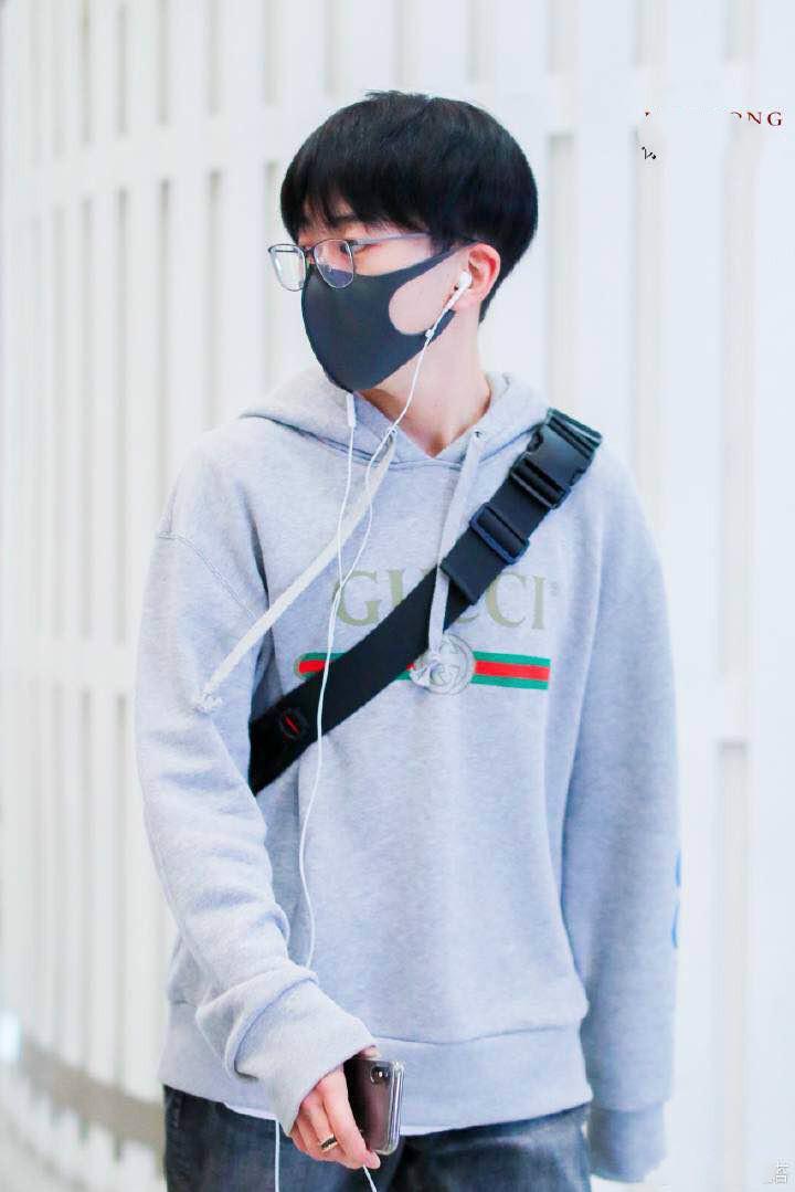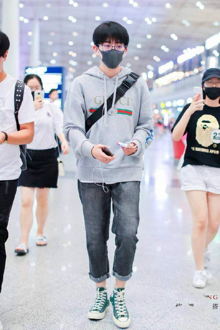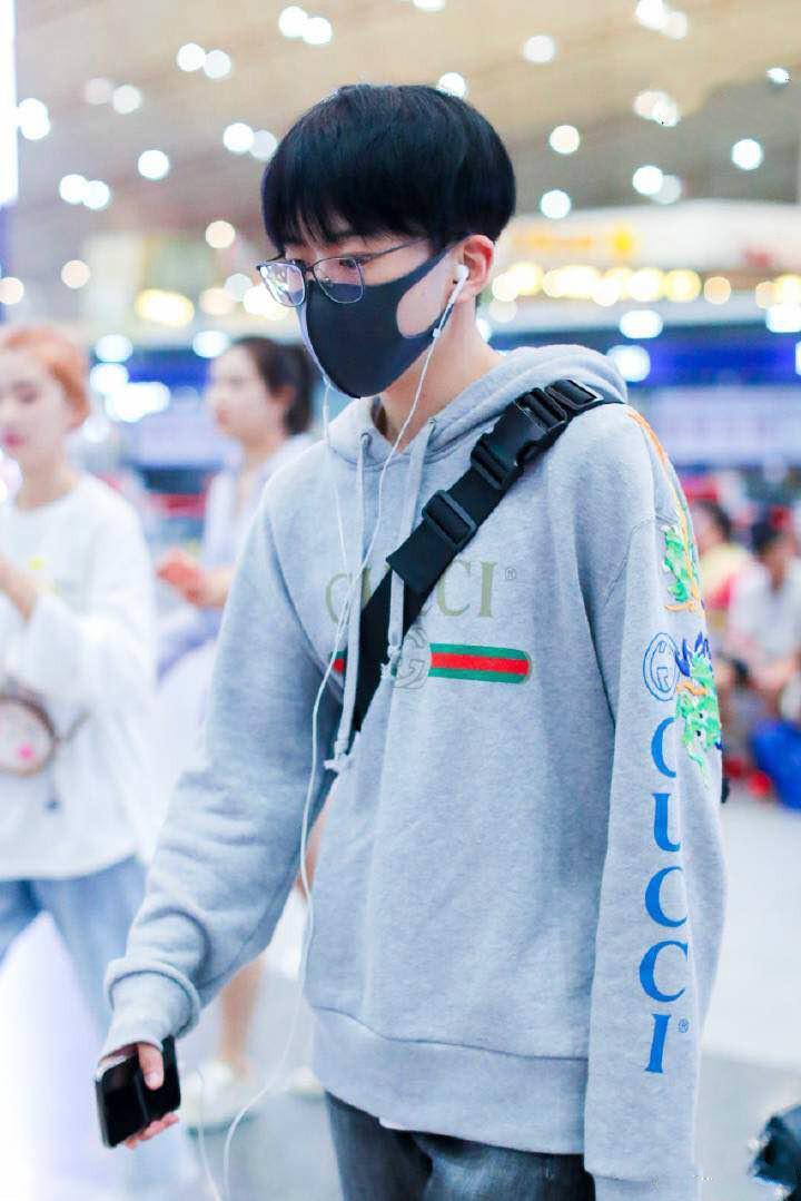 灰色卫衣上的logo图案高级感十足,据我对他多次机场秀的观察,他非常喜欢这个牌子的衣服,经典的连帽卫衣设计非常的有朝气,正符合他青春少年的气质。