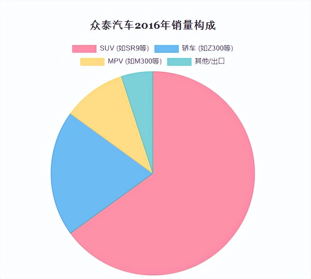 众泰汽车的产品线虽然一度丰富,但缺乏明星车型和核心技术支撑。下图展示了众泰汽车在2016年的销量构成,其中SUV车型贡献了主要销量,但这种依赖单一市场和模仿策略的模式在后续市场变化中显得极为脆弱。