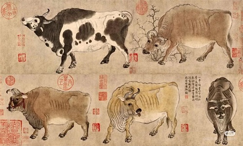 《五牛图》恰似一首质朴纯真、清新自然的田园牧歌,在岁月的深处悠悠唱响。韩滉以其简洁而富有表现力的笔触,赋予了画面上的五头牛鲜活的生命和独特的个性。这五头牛,有的悠然自得地漫步在田野间,步伐沉稳而从容,仿佛在享受着大自然的恩赐;有的低头专注地吃草,咀嚼间尽显岁月的宁静与安详;有的回首凝望,眼神中透露出一丝若有所思的神情,似乎在回味着往昔的故事。画家运用细腻而富有变化的线条,精准地勾勒出牛的骨骼结构和肌肉纹理,再以独特的晕染技法,将牛的皮毛质感表现得淋漓尽致、栩栩如生。这幅画作不仅仅是绘画技艺的精湛展示,更因其承载着历代文人墨客的情感寄托和文化传承,而成为中国绘画史上一座不朽的丰碑。它在历史的长河中静静流淌,历经风雨洗礼、岁月沧桑,却始终散发着温润而醇厚的艺术光芒,见证着时光的流转和艺术传承的坚韧力量,宛如一颗璀璨的星辰,在艺术的天空中永恒闪耀,照亮了我们对古代田园生活的向往与憧憬。