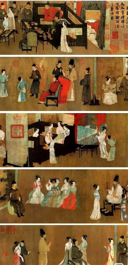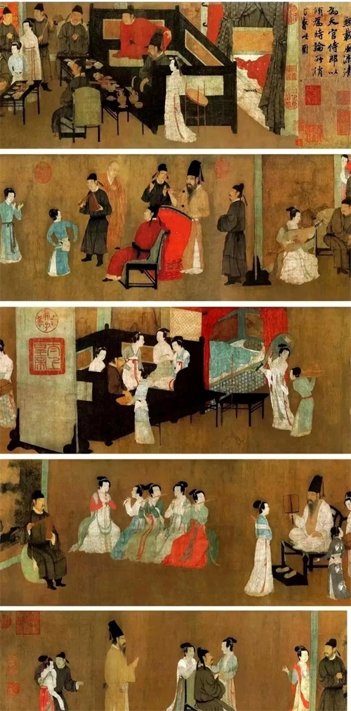 《韩熙载夜宴图》仿若一部精彩纷呈、扣人心弦的历史短剧,生动地再现了南唐大臣韩熙载夜宴宾客的盛大场景。画面依循夜宴的进程,自然流畅地分为多个段落,从宴会初起时的宾客云集、热闹非凡,到歌舞升平之际的丝竹悠扬、舞姿曼妙,再到宾客们休憩闲谈时的轻松惬意、意兴阑珊,每一个环节都被画家以细腻入微、纤毫毕现的笔触描绘得栩栩如生、跃然纸上。人物的表情丰富多样,或喜笑颜开,沉浸在欢乐的氛围之中;或神情专注,被精彩的表演所吸引;或若有所思,眼神中透露出内心深处的复杂情感。画家通过对细节的精雕细琢和对色彩的巧妙运用,营造出一种浓郁热烈而又不失高雅格调的艺术氛围,使观者仿若身临其境,亲身感受着那场夜宴的热闹喧嚣与奢华靡丽,同时也深刻地洞察到韩熙载在这繁华表象之下那颗忧国忧民、矛盾挣扎的内心世界。这幅画不仅是中国人物画领域的巅峰之作,更是研究南唐历史文化、社会风貌以及人物心境的关键钥匙,为我们打开了一扇窥探那个动荡飘摇却又文化繁荣时代的神秘之门,让我们得以在千年之后,依然能够与那些历史人物进行一场跨越时空的心灵对话,感受他们的喜怒哀乐、悲欢离合,体会那个时代的风云变幻与人性的复杂多面。