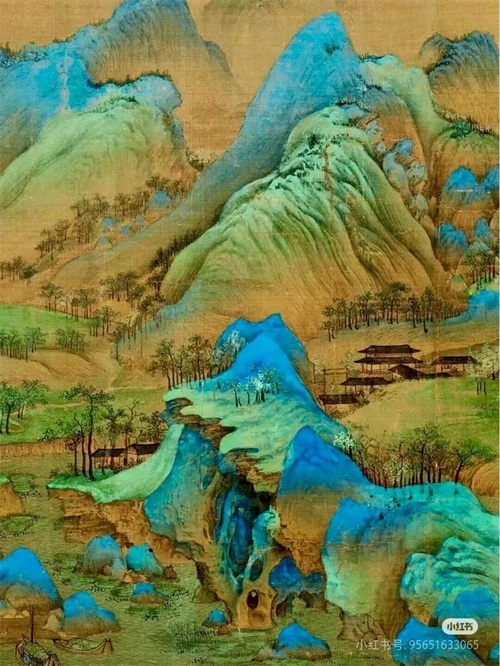 《千里江山图》宛如一首雄浑壮丽、气势磅礴的山水交响乐章,奏响了宋代山水绘画的华彩旋律。王希孟这位天赋异禀的绘画奇才,以其磅礴大气的胸怀和细腻入微的笔触,在广袤的画卷上勾勒出了一幅气势恢宏、景致万千的山水画卷。画卷之中,山峦连绵起伏,犹如巨龙蜿蜒盘旋,气势磅礴;江河奔腾浩渺,恰似银河倾泻而下,波澜壮阔;亭台楼阁错落有致地镶嵌于山水之间,增添了几分人间烟火气息;村落人家星罗棋布地散布在江畔溪边,洋溢着浓郁的生活情趣。画家巧妙地运用丰富多样的色彩和独特精湛的皴法,将山水的神韵与质感完美融合,营造出一种既雄浑壮阔、豪迈奔放,又清新雅致、婉约细腻的意境氛围。这幅画作不仅是宋代山水画艺术成就的杰出代表,更是中国绘画史上一座难以逾越的巍峨高峰,其美学价值和艺术造诣犹如璀璨星辰,在艺术的浩瀚宇宙中闪耀着永恒的光芒。它宛如一幅壮丽的山河颂歌,尽情歌颂着大自然的鬼斧神工和祖国山河的壮丽辽阔,让每一位观者在欣赏画作的瞬间,仿佛被一股神奇的力量牵引,瞬间置身于那片广袤无垠、如诗如画的山水之间,尽情领略着大自然的雄浑壮美与灵秀清幽,沉醉不知归路,激发起我们对祖国大好河山的无限热爱与敬仰之情。