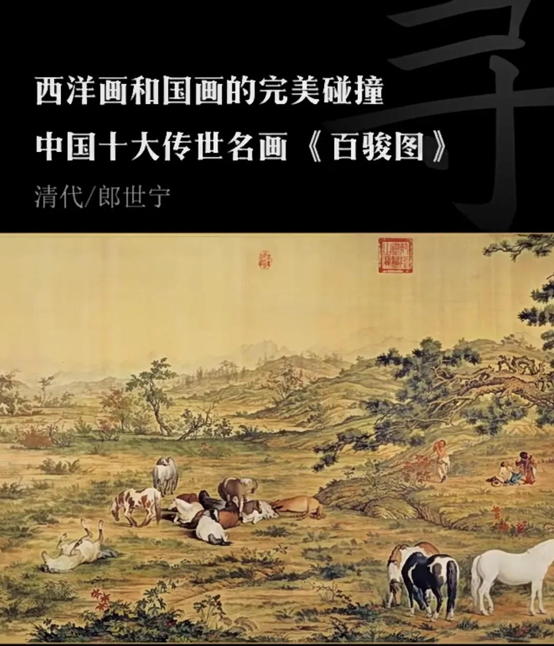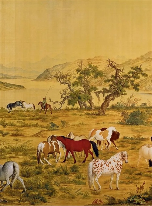 《百骏图》恰似一场东西方绘画艺术的精彩对话与完美融合,犹如一颗闪耀着独特光芒的艺术新星,在绘画的浩瀚星空中绽放出别样的光彩。郎世宁这位来自异国他乡的绘画巨匠,凭借其扎实深厚的西方绘画功底和对中国传统文化的深刻理解与热爱,将西方的写实主义绘画技巧与中国传统绘画的神韵意境巧妙地融合在一起,创作出了这幅独具匠心的《百骏图》。画中的百匹骏马,形态各异、栩栩如生,或奔腾嘶鸣、风驰电掣,展现出生命的激情与活力;或悠然自得、闲庭信步,流露出岁月的安闲与静好;或亲昵嬉戏、相互依偎,传递出动物之间的温情与友爱。画家在背景的描绘上,大胆创新地运用了西方的焦点透视法与中国传统绘画的散点透视法相结合的独特手法,使画面既有西方绘画所追求的立体感、真实感和空间感,又不失中国传统绘画所蕴含的神韵意境和文化底蕴,营造出一种既新颖独特又和谐统一的艺术效果。这幅画作不仅充分展示了郎世宁高超卓越的绘画技艺和独具慧眼的艺术创新精神,更为中国绘画的发展注入了新的活力与元素,开辟了一条融合东西方绘画艺术之长的崭新道路,成为了中西文化交流与艺术融合的典范之作,让我们在欣赏画作的同时,也深刻领略到了文化交流与碰撞所产生的奇妙火花和无限魅力,拓宽了我们对绘画艺术多元发展的视野与认知。