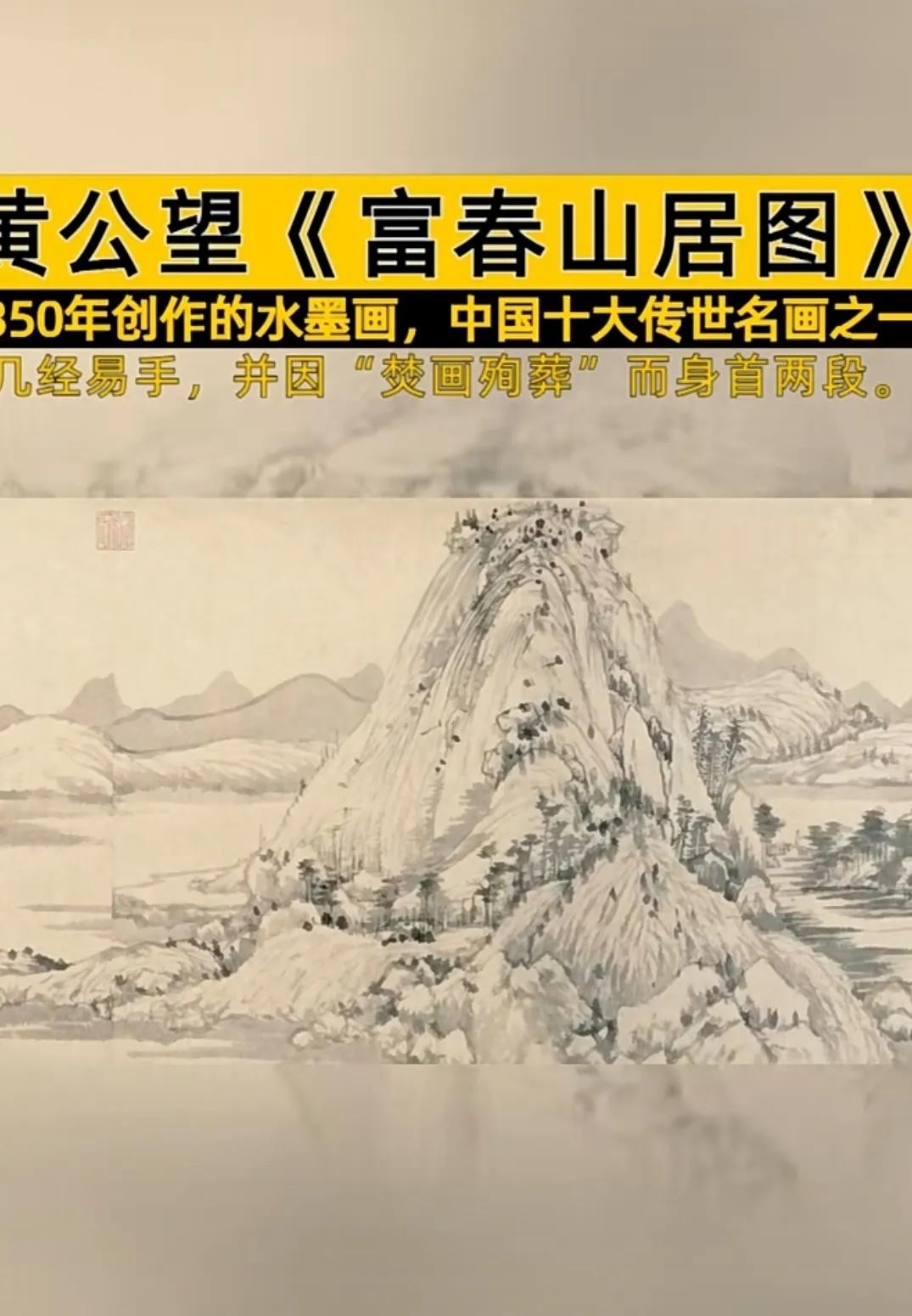 《富春山居图》宛如一首清新淡雅、空灵悠远的田园牧歌,缓缓流淌在岁月的长河之中,吟唱着富春江畔的山水神韵与宁静祥和的生活之美。黄公望这位绘画大师,以其超凡脱俗的心境和独具匠心的笔墨技法,将富春江一带的山水风光描绘得淋漓尽致、入木三分。在画卷之上,山峦起伏跌宕、错落有致,仿佛是大地的脊梁在自然的怀抱中舒展;江水潺潺流淌、波光粼粼,恰似一条灵动的丝带蜿蜒于山间谷底;树木郁郁葱葱、繁茂昌盛,为这片山水增添了无尽的生机与活力。画家通过对墨色的浓淡干湿巧妙运用和线条的疏密粗细精心安排,恰到好处地营造出一种空灵悠远、静谧祥和的意境氛围,使观者仿若置身于一个远离尘世喧嚣、纯净无污染的世外桃源之中,心灵得到了前所未有的宁静与慰藉。这幅画作不仅在艺术造诣上达到了登峰造极的境界,更因其传承过程中的曲折离奇故事,成为了两岸文化交流与情感纽带的重要象征,见证了中华民族文化一脉相承、绵延不绝的坚韧力量和顽强生命力。它宛如一颗璀璨的文化明珠,在历史的长河中闪耀着独特的光芒,照亮了我们追寻传统文化根源的道路,让我们深刻感受到中华民族文化的博大精深与源远流长,以及其所蕴含的那种对自然、对生活的深深热爱与敬畏之情,激发起我们对传统文化传承与保护的强烈责任感与使命感。