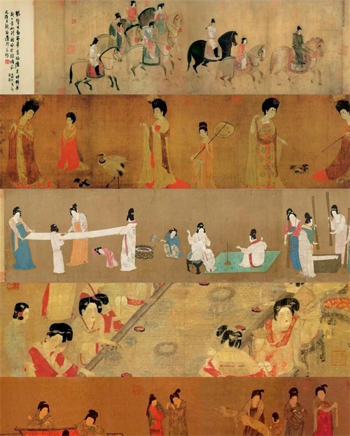 《唐宫仕女图》宛如一幅绚丽多彩、生动鲜活的唐代宫廷生活浮世绘,将那个繁华盛世的人间百态尽情展现在我们眼前。张萱和周昉这两位丹青妙手,以其敏锐的观察力和精湛的技艺,捕捉到了宫廷仕女们生活中的每一个瞬间和情感的细微变化。画中的仕女们,或慵懒地倚榻梳妆,眼神中透露出一丝淡淡的闲适与落寞;或三两成群地在花园中嬉戏打闹,欢声笑语仿佛穿越时空传入耳畔;或优雅地弹奏着丝竹管弦,指尖流淌出的音符仿佛在空气中弥漫。从她们华丽服饰上精美的刺绣花纹,到别具一格的发髻发饰所展现的时尚潮流;从宫廷建筑的奢华装饰细节,到园林景观的精致布局,无一不是那个时代文化繁荣与社会昌盛的生动写照。这些画作犹如一面澄澈的镜子,清晰地折射出唐代社会的多元包容、文化的繁荣兴盛以及女性的独特魅力与精神追求。它们让我们仿若穿越时空的隧道,亲身漫步于那个辉煌灿烂的时代长廊之中,沉浸在其浓郁醇厚的文化氛围里,领略其别具一格的时代风情,感受那个时代人们对生活的热爱与对美的执着追求。