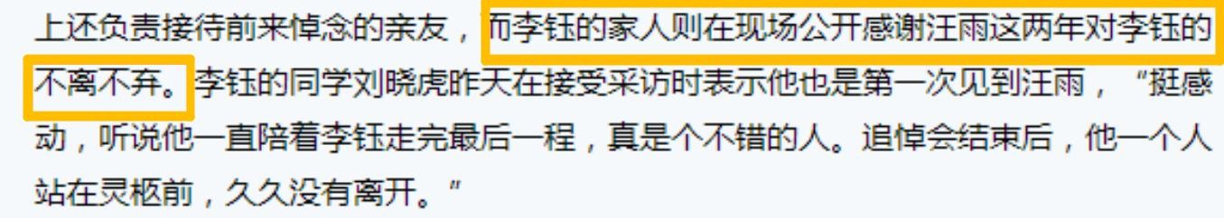 很多人也同样被汪雨的深情给感动,例如李钰的大学同学、演员刘晓虎便表示:“挺感动,听说他一直陪着李钰走完最后一程,真是个不错的人,追悼会结束后,他一个人站在灵柩前,久久没有离开。”