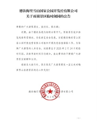 2月24日,德钦美丽雪山国家公园开发经营有限公司在其官方公众号公告称,因德钦县境内持续冰雪天气,雨崩景区徒步游览线路积雪结冰,存在游览安全隐患,目前德钦梅里雪山国家公园开发经营有限公司组织开展隐患检查排除工作。