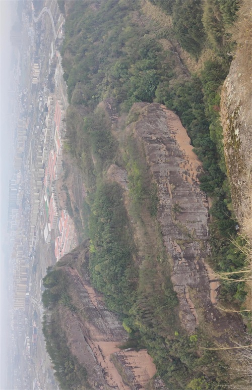 站在小平地前望去,眼前耸立着的是一座巉峻峥嵘的小山峰,四周全为峭壁形成,而峭壁中间有一条裂缝,裂缝的宽度,仅及一个稍肥胖的人。人们在裂缝中架了许多段木棍,要登峰的人,就得手脚并用,攀着、踩着、踏着木棍,如猿猴般攀爬而上,倘若失手,那就尸骨无存,不堪设想