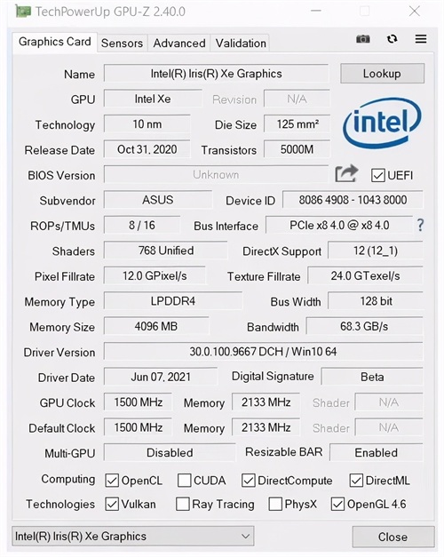 这是GPU-Z对英特尔DG1显卡的识别数据,我们能从这张图清楚地看到该显卡的具体信息。不过值得一提的是,GPU-Z对该显卡的核心数识别错误,桌面版DG1相较于移动端DG1阉割了一些硬件。