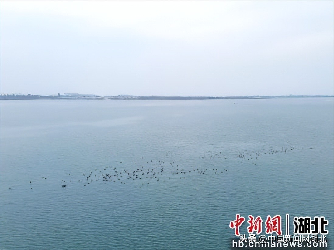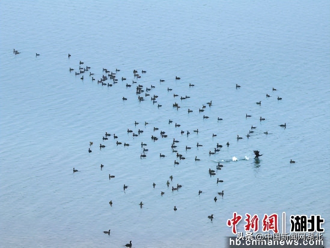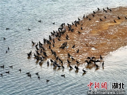 中新网湖北新闻12月10日电 (叶玉兵)国家二级保护动物鸬鹚近日成群飞抵荆门漳河水库越冬,它们时而低飞盘旋,时而潜水觅食,成为一道靓丽的生态风景线。