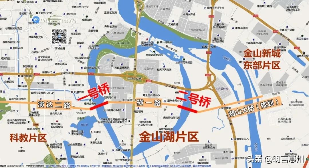 目前,惠州市金山湖一号桥和二号桥项目主体钢箱梁都已合龙,主桥已基本建成。两座桥梁计为双向6车道,贯穿了整个金山湖湖心岛。这一东西走向的横向道路,串联起河南岸马庄片区、麦地片区与金山湖岛内和湖山片区,有效缓解金山湖片区的通行压力,方便市民出行。