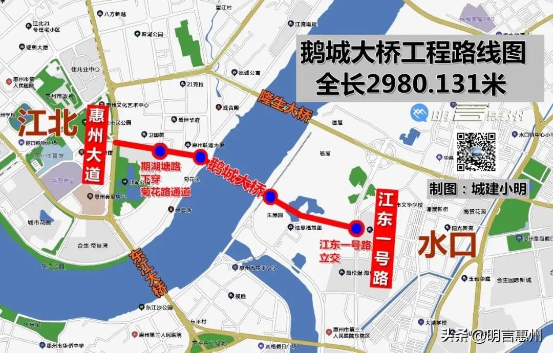 惠州鹅城大桥工程于2021年11月动工,是中心城区新增过江通道的重大工程,主线全长2974.32米,其中大桥全长1119.5米,主要包括鹅城大桥及相接道路,按双向6车道设计。