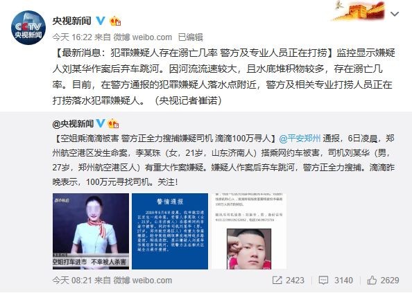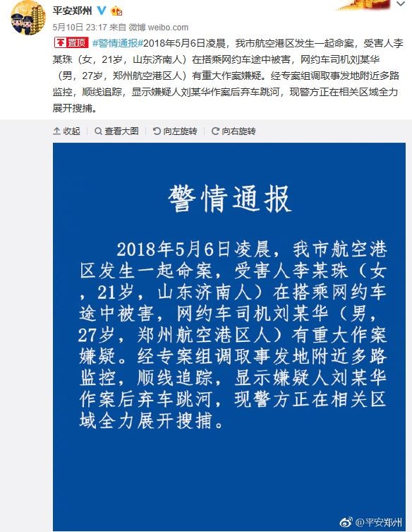 5月10日晚23:17,郑州市公安局官方微博@平安郑州 发布警情通报:2018年5月6日凌晨,我市航空港区发生一起命案,受害人李某珠(女,21岁,山东济南人)在搭乘网约车途中被害,网约车司机刘某华(男,27岁,郑州航空港区人)有重大作案嫌疑。经专案组调取事发地附近多路监控,顺线追踪,显示嫌疑人刘某华作案后弃车跳河,现警方正在相关区域全力展开搜捕。