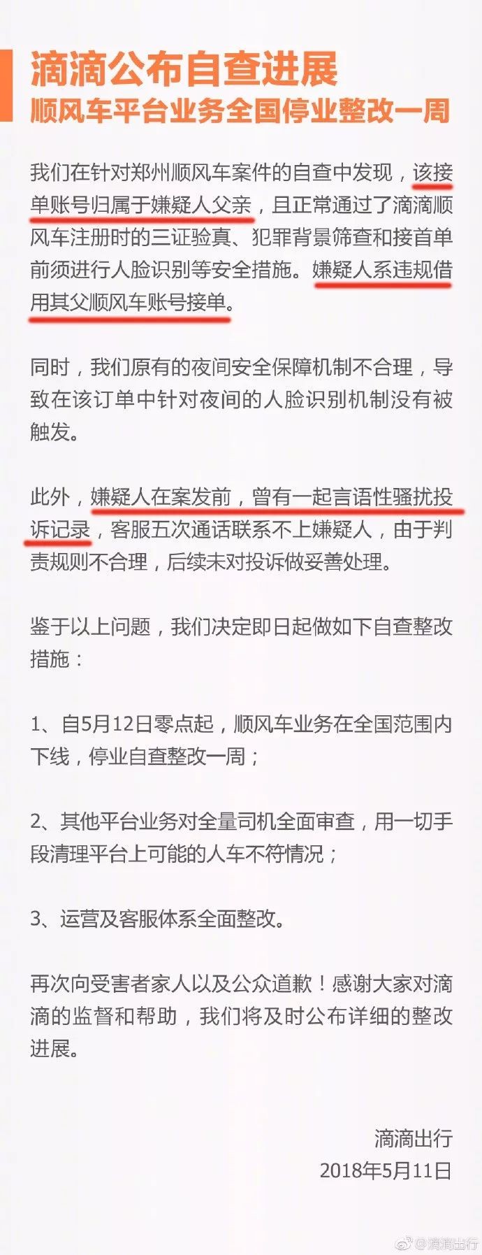 对此,滴滴方面表示,真诚地和李女士的家人道歉,作为平台,滴滴辜负了用户的信任,在这件事上负有不可推卸的责任。滴滴将尽最大努力协助警方尽快破案,将凶手绳之以法,还李女士和家人一个公道,同时全面彻查各项业务,避免类似事件的发生。