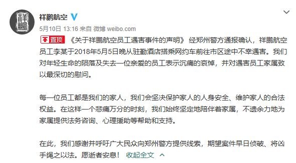 5月10日下午13时16分,@祥鹏航空发布了题为《关于祥鹏航空员工遇害事件的声明》: