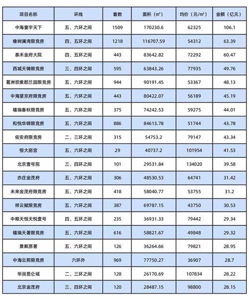 石景山区的中海寰宇天下以106.1亿元的成交金额夺得了北京2019年度的销冠,这是北京近10年来第一个破百亿的项目;丰台区的橡树澜湾以63.39亿元的成交额位列第二;第三是丰台区的泰禾金府大院,全年成交60.47亿元。