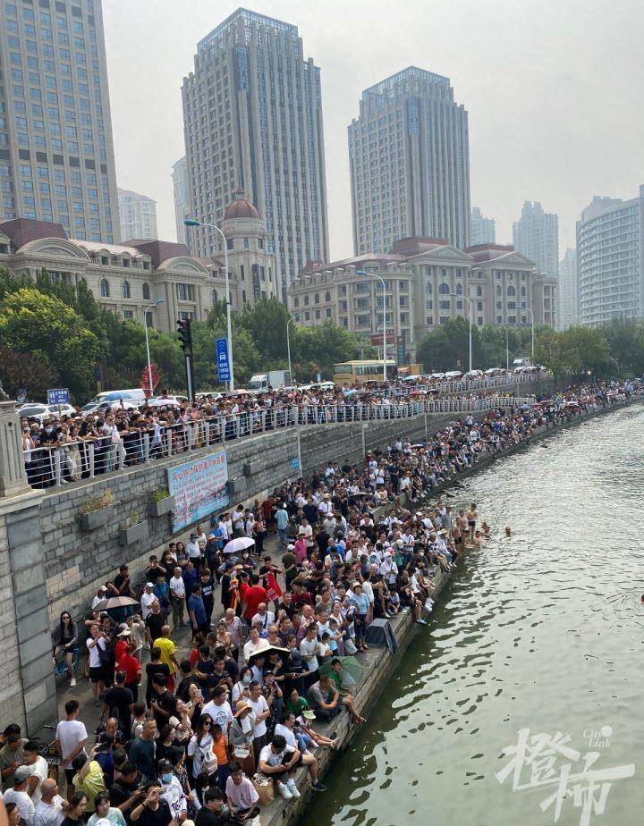 一辆大巴车开到狮子林桥旁,十多位大爷大妈扛着“**游泳队”旗帜,他们是从北京、黑龙江虎林、吉林四平等地专程赶来天津跳水。这些大爷大妈成了当地的名人,现场掌声不断。他们表示要支持这个活动。